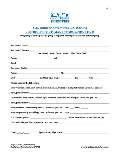 The forms below pertain primarily to guided hunt packages. Find details under Our Property.